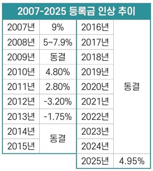 학부 등록금 12년 만에 인상… 과거 본교는? 올해 본교는 학부 등록금을 4.95% 인상하며 지난 2011년 이후 처음으로 학부 등록금 인상을 결정했다. 본지가 분석한 ‘2007년 ~2025년 학부 등록금 증감 추이’ 자료에 따르면 본교는 △2007~2008년: 인상 △2009: 동결 △2010~2011: 인상 △2012~2013: 인하 △2014~2024: 동결을 택했다. 본교는 지난 2007년 학부 등록금을 9% 인상했으며 2008년에도 최저 5%에서 최고 7.9%까지 학과별 차등 적용했다. 2009년에는 전년도 인상분을 동결했