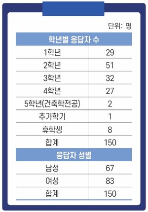 본지는 본교 재적생 150명을 대상으로 취업인식 설문조사를 진행했다. 본 설문조사는 △학년 △성별 △단과대학 △선호 기업 △선호 직무 △희망 연봉 등 12개의 문항으로 구성됐다. 단과대학별 △인문대: 19명 △자연대: 14명 △법대: 13명 △사회대: 20명 △경통대: 11명 △경영대: 15명 △공대: 25명 △IT대: 25명 △자유전공학부: 8명이 설문에 참여했다. 본교 학생들이 가장 선호하는 기업은 무엇이며, 원하는 연봉은 얼마일까. 생생하게 담아낸 학생들의 취업과 관련한 의견을 알아봤다. 학생들이 원하는 취업은? 본교 학생들이