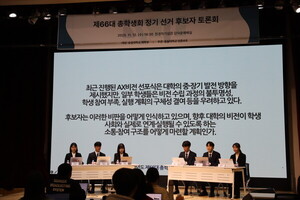 지난 10일(월) 2026학년도 제66대 총학생회(이하 총학) 후보자와 제13대 중앙감사위원회(이하 중감위) 후보자에 대한 합동공청회가 개최됐다. 각 후보자는 공청회에서 자신들의 공약에 대해 신문방송국과 청중들의 질의에 답하는 시간을 가졌다. 기호 1번 ‘숭실을 향한 집중, FOCUSS:U’ 선거운동본부△박충만(벤처중소·23) 정후보(이하 정) △안가은(산업정보·23) 부후보 △이시은 (글로벌미디어·23) 부후보 숭대시보: 전임교원 확충 요구를 공약했다. 올해 본교가 전임교원 선발을 위해 노력했지만, 기대만큼 성과를 내지 못했다.