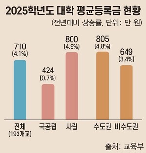 지난달 30일(수) 대학알리미에 공시된 2025학년도 등록금 현황에 따르면 4년제 일반대학 및 교육대학 193개교 중 136개교인 70.5%가 등록금을 인상한 것으로 나타났다. 등록금을 동결한 대학은 57개로 29.5%에 그쳤다. 2025학년도 학생 1인당 평균 등록금은 약 710.7만 원으로 2024학년도 대비 4.1%, 약 27.7만 원 상승한 수치다. 평균 등록금은 학과별·학년별 등록금에 해당 입학정원을 곱한 전체 등록금의 합을 전체 입학 정원의 총합으로 나눠 계산한다. △설립 유형 △대학 소재지 △계열에서도 등록금 차이가 있