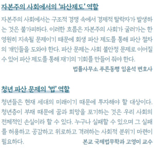 최근 몇 년 사이 20대 청년들의 개인파산 및 회생 신청이 급증하고 있다. △학자금 대출 △불안정한 노동시장 △급등한 주거비 등으로 인해 갚을 수 없는 빚의 무게를 짊어진 청년들이 늘어나고 있는 것이다. 파산은 더 이상 패배의 낙인이 아닌 재기하기 위한 제도적 장치로 바라봐야 한다. 본지는 서울회생법원 파산관재인 겸직 임윤석 변호사와 한국도산법학회의 등기이사인 고영미 교수를 만나 청년 파산의 현실과 그 이면에 숨은 사회 구조적 문제를 짚어봤다. 개인파산, 빚을 정리하고 다시 서기 위한 제도 개인파산은 빚을 스스로 갚기 어려운 상황에