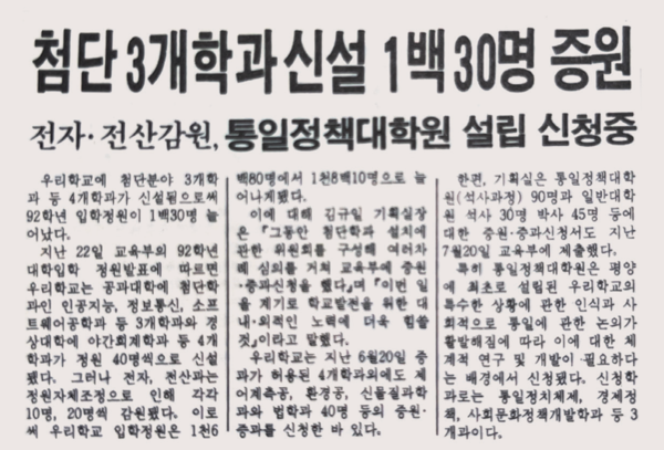 본교 공과대학에 첨단학과인 △인공지능학과 △정보통신학과 △소프트웨어공학과가 신설됐다. 이로써 92학년도 입학 정원이 130명 늘어났다.