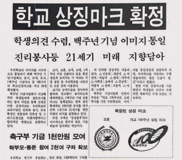 본교 백주년 기업사업회는 본교의 이미지를 시각적으로 통일하기 위해 △교기 △교색 △로고 △1백주년 기념 마크 등 약 8가지의 학교 상징마크를 확정했다. 교색은 ‘숭실블루’라는 사이색으로 한국의 맑은 가을 하늘과 일치하는 색이다.