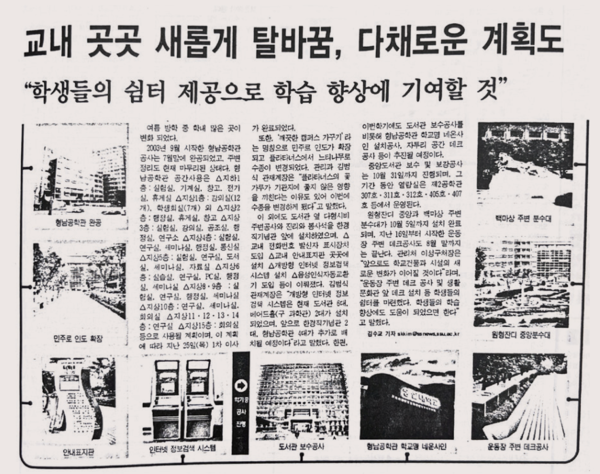 여름 방학 중 학내 많은 곳이 변화됐다. 2003년 9월 시작한 형남공학관 공사가 완공됐고, 주변 정리도 마무리 된 상태다. 또한 △민주로 인도 확장 △백마상 주변과 원형잔디 분수대 설치 △운동장 주변 데크 공사 △형남공학관 학교명 네온사인 등이 설치됐다.