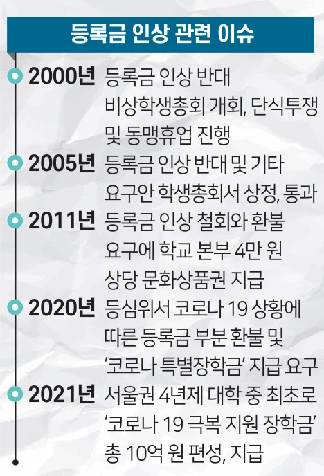 본교는 지난 2013년 학부 등록금을 1.75% 인하한 이후 2014년부터 지난해까지 등록금 동결을 유지해 왔다. 지난 12년간 동결 및 인하 정책을 유지해 오며 코로나 19 등의 시기적 상황에 더해 학교 본부의 인상 논의 및 학생의 반환 요구가 매년 이어져 왔다.