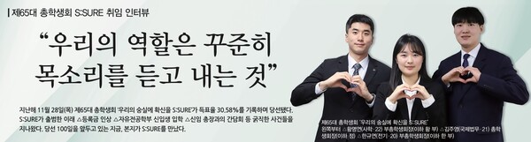 지난해 11월 28일(목) 제65대 총학생회 ‘우리의 숭실에 확신을 S:SURE’가 득표율 30.58%를 기록하며 당선됐다. S:SURE가 출범한 이래 △등록금 인상 △자유전공학부 신입생 입학 △신임 총장과의 간담회 등 굵직한 사건들을 지나왔다. 당선 100일을 앞두고 있는 지금, 본지가 S:SURE를 만났다.