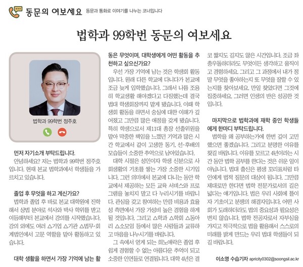 안녕하세요? 저는 법학과 99학번 정주호입니다. 현재 본교 법학과에서 학생들을 가르치고 있습니다.