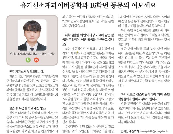 안녕하세요. 다이텍연구원 디지털공정연 구센터에서 전임연구원으로 근무하고 있는 구본학입니다. 본교 16학번으로 유기신소재 파이버공학과를 졸업하고 신소재공학과 김 주용 교수님 지도하에 스마트웨어러블, AI 등을 전공해 석사를 졸업했습니다.