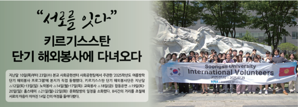 2025학년도 여름방학 단기 해외봉사 프로그램은 본교 재학생과 휴학생을 대상으로 진행됐다. 해당 프로그램은 건학이념인 ‘진리와 봉사’를 바탕으로 교육 및 노력 봉사활동을 통해 △수혜국의 교육격차 해소 △글로벌 마인드 배양 △국제 경쟁력을 갖춘 리더 양성 등을 목적으로 지난 2018년 시작해 올해로 6년째 진행되고 있다. 이번 2025학년도 하계방학 단기 해외봉사 프로그램의 파견 장소는 키르기스스탄 오시와 몽골 울란바토르다.