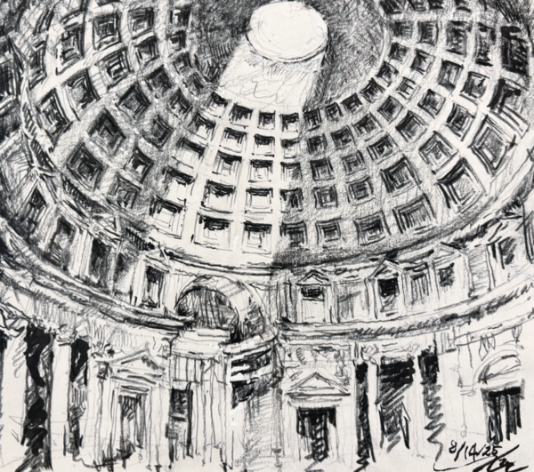 그런 로마에서도 판테온은 여러 유적 중에서 단연 으뜸이다. 반쯤 무너진 콜로세움과 달리 판테온은 장구한 세월을 이겨내고 온전한 모습을 간직하고 있다. 콘크리트로 지어 진 판테온, “판(pan)”은 모두를 뜻하는 접두어이고 “테온(theon)”은 신성 혹은 초월을 뜻하는 단어이니 다수의 신에게 제사를 올렸던 당시로선 꽤 중요하고 숭고한 건축물이었을 것이다. 건설 연도가 기원후 126년에서 128년으로 알려져 무려 1900년 가까이 비바람에 맞서 견고하게 지탱해온 셈이다. 철근조차 없이 고대 콘크리트로만 지은 이 건축물은 어떻게 이처럼 오랜 세월 지탱할 수 있었을까?