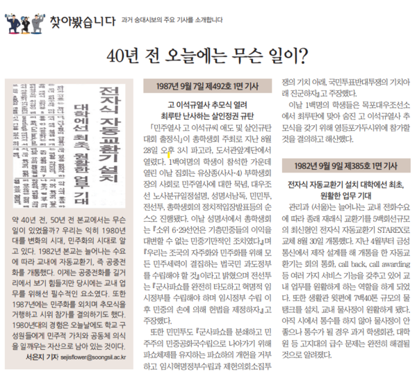 서은지 기자 sejisflower@soongsil.ac.kr 기자의 다른기사 저작권자 © 숭대시보 무단전재 및 재배포 금지 개의 댓글 회원로그인 작성자 비밀번호 댓글 내용입력 댓글 정렬 최신순 추천순 답글순 BEST댓글 BEST 댓글 답글과 추천수를 합산하여 자동으로 노출됩니다. 닫기 더보기 댓글삭제 삭제한 댓글은 다시 복구할 수 없습니다. 그래도 삭제하시겠습니까? 비밀번호 닫기 댓글수정 댓글 수정은 작성 후 1분내에만 가능합니다. 본문 / 400 비밀번호 닫기 내 댓글 모음 닫기 주요기사 지식과 열정으로 지식재산권을 품다 글로벌통상학과 12학번 동문의 여보세요 '노들 글로벌 예술섬'을 기다리며 청년 파산과 사회적 안전망 순국선열의 날을 기리며 학생대표자의 역할이란 무엇인가?