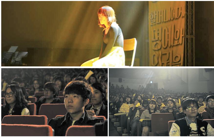 길원옥 할머니 : 여러분들 지금도 학교 다니느라 바쁠 텐데 이렇게 와 주셔서 고맙습니다. 학교에서 공부를 하는 것도 좋지만 저희들이 말하는 것을 듣는 것도 좋을 거예요. 여러분들 고맙습니다. 전쟁 없는 나라 평화의 나라가 됐으면 좋겠다는 것 밖에 말씀드릴 게 없어요. 전쟁 있는 나라에서는 우리 같은 사람이 생기지 말란 법이 없거든요. 우리 같은 사람이 안 생기려면 전쟁이 없어야 하니까 전쟁 없는 평화의 나라가 돼서 앞으로 여러분들은 저희 같은 아픔 없이, 편안한 좋은 세상에서만 살았으면 좋겠습니다. 나비들이 훨훨 날아서 다시는 우리들 같이 괴로운 사람들이 없고, 우리도 하루빨리 이 문제에서 해방이 되도록 해 줬으면 좋겠습니다.