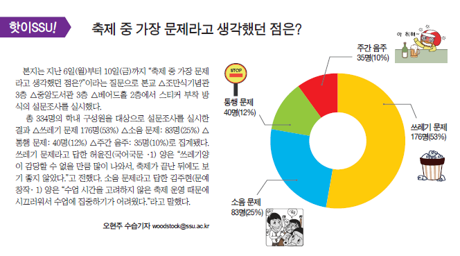 오현주 수습기자 woodstock@ssu.ac.kr 저작권자 © 숭대시보 무단전재 및 재배포 금지 개의 댓글 회원로그인 작성자 비밀번호 댓글 내용입력 댓글 정렬 최신순 추천순 답글순 BEST댓글 BEST 댓글 답글과 추천수를 합산하여 자동으로 노출됩니다. 닫기 더보기 댓글삭제 삭제한 댓글은 다시 복구할 수 없습니다. 그래도 삭제하시겠습니까? 비밀번호 닫기 댓글수정 댓글 수정은 작성 후 1분내에만 가능합니다. 본문 / 400 비밀번호 닫기 내 댓글 모음 닫기 주요기사 지식과 열정으로 지식재산권을 품다 글로벌통상학과 12학번 동문의 여보세요 '노들 글로벌 예술섬'을 기다리며 청년 파산과 사회적 안전망 순국선열의 날을 기리며 학생대표자의 역할이란 무엇인가?