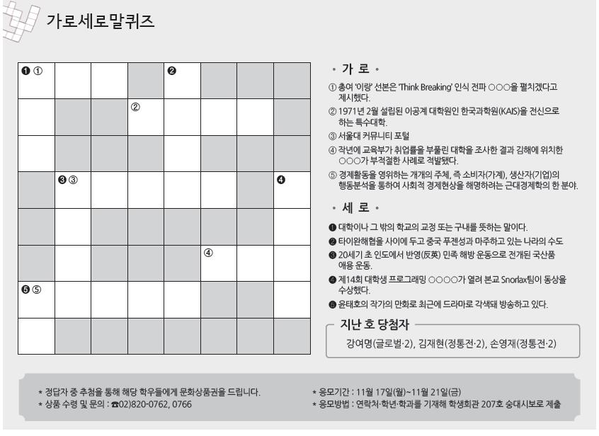 주요기사 지식과 열정으로 지식재산권을 품다 글로벌통상학과 12학번 동문의 여보세요 '노들 글로벌 예술섬'을 기다리며 청년 파산과 사회적 안전망 순국선열의 날을 기리며 학생대표자의 역할이란 무엇인가?