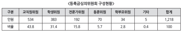 「고등교육법」 제11조 2항에 의하면 학교는 등록금을 책정하기 위해 교직원, 학생, 관련 전문가등으로 구성된 등심위를 설치ㆍ운영해야 하며 그 중 학생 위원은 전체 위원 정수의 10분의 3 이상이 되야 한다고 명시돼있다. 이는 학교 측의 일방적인 등록금 인상을 방지하고 학생들의 의견을 보장하기 위함이다. 학생들은 이 같은 등심위 위원 구성 비율에 관해 불만을 표하고 있다. 학생 위원들이 과반이 되지 않아 학생들이 모두 거부해도 학교 의사대로 등심위가 진행될 수 있다는 것이다. 실례로 올해 인하대학교는 다섯 차례의 등심위를 거쳤음에도 불구하고 입장차를 좁히지 못해 파행으로 치달았다. 학교 측의 등록금 인상안을 도저히 받아들일 수 없다며 학생 위원들이 의결을 거부한것이다. 이렇게 학생 위원이 전부 거부했지만, 과반이 넘는 위원이 찬성해서 의결은 진행됐다. 인하대 등심위 구성은 학생 위원 4명, 학교차장단 3명, 교직원노조 1명, 교수 1명, 외부인사 1명으로 이뤄졌다. 이에 인하대 최성범(컴공·10) 부총학생 회장은 “이렇다보니 학생들과 같이 의결을 하자는 건지 아니면 그저 심의만 하고 ‘너네들이 이야기 했잖아.’ 식의 명분만 주는 건지 잘 모르겠다.”고 밝혔다. 이 상황은 타 학교도 마찬가지다. 고려대학교 총학생회 박세훈(자유전공·13) 사회연대국장은 “고려대도 매년 학생위원들이 모두 퇴장하고 결국엔 학교 측 위원 6인과 총장추천 전문가 1인만의 의결로 등록금이 책정되곤 한다.”며 불만을 표했다. 이렇게 학교 측과 학생 간의 등록금 책정 합의가 이뤄지지 않는 것은 학내 구성원 전체의 피해도 야기할 수 있는 위험이 있다. 등록금 고지서가 나오는 날까지 등심위를 완료하지 못해 등록금이 책정되지 않으면, 국가장학금이 지급되지 않기 때문이다.