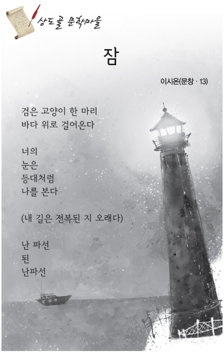 잠 이시온(문창·13) 검은 고양이 한 마리 바다 위로 걸어온다 너의 눈은 등대처럼 나를 본다 (내 길은 전복된 지 오래다) 난 파선 된 난파선 이시온 (문창·13) 저작권자 © 숭대시보 무단전재 및 재배포 금지 개의 댓글 회원로그인 작성자 비밀번호 댓글 내용입력 댓글 정렬 최신순 추천순 답글순 BEST댓글 BEST 댓글 답글과 추천수를 합산하여 자동으로 노출됩니다. 닫기 더보기 댓글삭제 삭제한 댓글은 다시 복구할 수 없습니다. 그래도 삭제하시겠습니까? 비밀번호 닫기 댓글수정 댓글 수정은 작성 후 1분내에만 가능합니다. 본문 / 400 비밀번호 닫기 내 댓글 모음 닫기 주요기사 지식과 열정으로 지식재산권을 품다 글로벌통상학과 12학번 동문의 여보세요 '노들 글로벌 예술섬'을 기다리며 청년 파산과 사회적 안전망 순국선열의 날을 기리며 학생대표자의 역할이란 무엇인가?