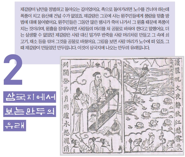 제갈량이 남만을 정벌하고 돌아오는 길이었어요. 촉으로 돌아가려면 노수를 건너야 하는데 폭풍이 치고 음산해 건널 수가 없었죠. 제갈량은 그곳에 사는 원주민들에게 풍랑을 멈출 방법에 대해 물어봤어요. 원주민들은 그동안 많은 병사가 죽어 나가서 그 원흉 때문에 폭풍이 치는 것이라며, 원흉을 잠재우려면 사람들의 머리를 쳐 공물로 바쳐야 한다고 말했어요. 더는 살생할 수 없었던 제갈량은 사람 대신 밀가루 반죽을 사람 머리처럼 만들고 그 속에 쇠고기, 채소 등을 섞어 그것을 공물로 바쳤어요. 그림을 보면 사람 머리가 노수에 떠 있죠. 그때 제갈량이 만들었던 만두입니다. 이것이 삼국지에 나오는 만두의 유래입니다.