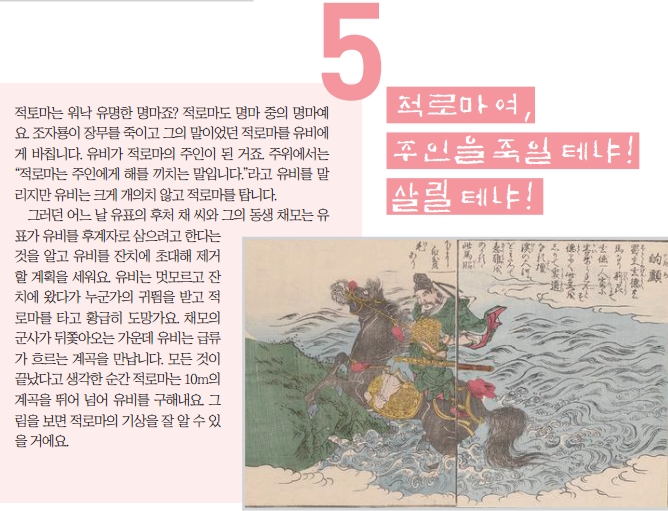 적토마는 워낙 유명한 명마죠? 적로마도 명마 중의 명마예요. 조자룡이 장무를 죽이고 그의 말이었던 적로마를 유비에게 바칩니다. 유비가 적로마의 주인이 된 거죠. 주위에서는 “적로마는 주인에게 해를 끼치는 말입니다.”라고 유비를 말리지만 유비는 크게 개의치 않고 적로마를 탑니다.