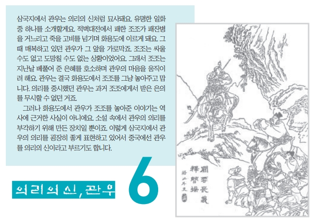 삼국지에서 관우는 의리의 신처럼 묘사돼요. 유명한 일화 중 하나를 소개할게요. 적벽대전에서 패한 조조가 패잔병을 거느리고 죽을 고비를 넘기며 화용도에 이르게 돼요. 그때 매복하고 있던 관우가 그 앞을 가로막죠. 조조는 싸울 수도 없고 도망칠 수도 없는 상황이었어요. 그래서 조조는 지난날 베풀어 준 은혜를 호소하며 관우의 마음을 움직이려 해요. 관우는 결국 화용도에서 조조를 그냥 놓아주고 맙니다. 의리를 중시했던 관우는 과거 조조에게서 받은 은의를 무시할 수 없던 거죠.