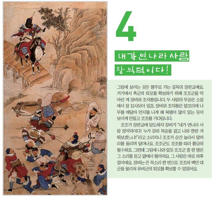 그림에 보이는 곳은 형주로 가는 길목의 장판교예요. 거기에서 촉군의 퇴로를 확보하기 위해 조조군을 막아선 게 장비와 조자룡입니다. 두 사람의 무공은 소설에서 잘 묘사되어 있죠. 장비와 조자룡은 말꼬리에 나무를 매달아 먼지를 나게 해 복병이 많이 있는 듯이 보이게 만들고 조조를 기다립니다.