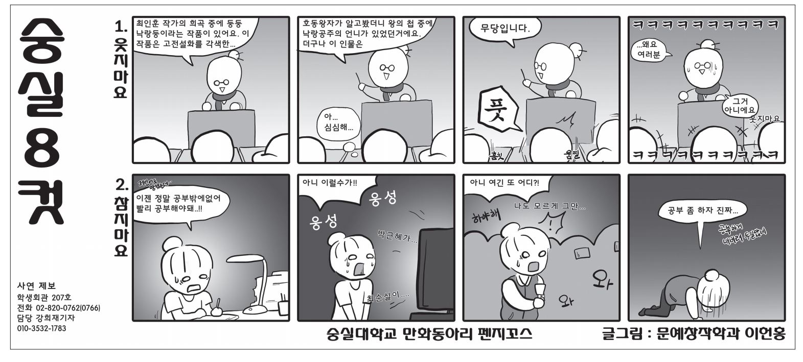 이헌홍(문예창작‧15) . 저작권자 © 숭대시보 무단전재 및 재배포 금지 개의 댓글 회원로그인 작성자 비밀번호 댓글 내용입력 댓글 정렬 최신순 추천순 답글순 BEST댓글 BEST 댓글 답글과 추천수를 합산하여 자동으로 노출됩니다. 닫기 더보기 댓글삭제 삭제한 댓글은 다시 복구할 수 없습니다. 그래도 삭제하시겠습니까? 비밀번호 닫기 댓글수정 댓글 수정은 작성 후 1분내에만 가능합니다. 본문 / 400 비밀번호 닫기 내 댓글 모음 닫기 주요기사 지식과 열정으로 지식재산권을 품다 글로벌통상학과 12학번 동문의 여보세요 '노들 글로벌 예술섬'을 기다리며 청년 파산과 사회적 안전망 순국선열의 날을 기리며 학생대표자의 역할이란 무엇인가?