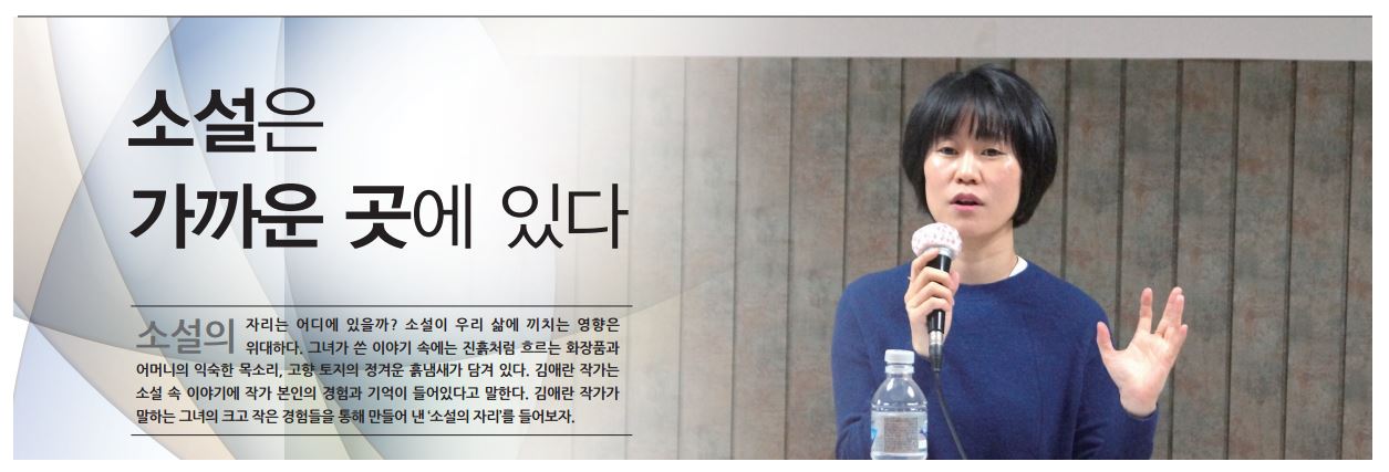 소설의 자리는 어디에 있을까? 소설이 우리 삶에 끼치는 영향은 위대하다. 그녀가 쓴 이야기 속에는 진흙처럼 흐르는 화장품과 어머니의 익숙한 목소리, 고향 토지의 정겨운 흙냄새가 담겨 있다. 김애란 작가는 소설 속 이야기에 작가 본인의 경험과 기억이 들어있다고 말한다. 김애란 작가가 말하는 그녀의 크고 작은 경험들을 통해 만들어 낸 ‘소설의 자리’를 들어보자.