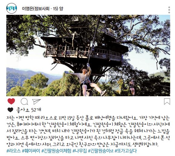 저는 이번 방학 때 라오스로 11박 13일 동안 홀로 배낭여행을 다녀왔어요. 가장 기억에 남는 것은, 훼이싸이에서 한 ‘긴팔원숭이 체험’이에요. 긴팔원숭이 체험은 긴팔원숭이의 서식지에서 짚라인을 타는 것인데, 마치 내가 긴팔원숭이가 된 것처럼 정글 속을 헤쳐 나가는 느낌을 받아요. 스무 번 이상의 짚라인을 타고 나면 사진 속의 나무집이 나타나는데, 그곳에서 본 석양과 자연 속에서의 샤워, 그리고 외국인 친구와의 만남은 지금까지도 생생하답니다.