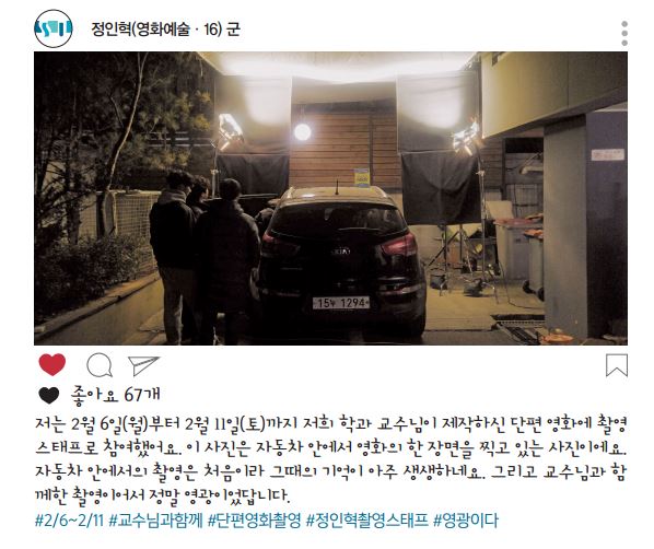 저는 2월 6일(월)부터 2월 11일(토)까지 저희 학과 교수님이 제작하신 단편 영화에 촬영 스태프로 참여했어요. 이 사진은 자동차 안에서 영화의 한 장면을 찍고 있는 사진이에요. 자동차 안에서의 촬영은 처음이라 그때의 기억이 아주 생생하네요. 그리고 교수님과 함께한 촬영이어서 정말 영광이었답니다.