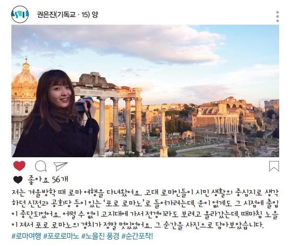 저는 겨울방학 때 로마 여행을 다녀왔어요. 고대 로마인들이 시민 생활의 중심지로 생각하던 신전과 공회당 등이 있는 ‘포로 로마노’로 들어가려는데, 운이 없게도 그 시점에 출입이 중단되었어요. 어쩔 수 없이 고지대에 가서 전경이라도 보려고 올라갔는데, 때마침 노을이 져서 포로 로마노의 경치가 정말 멋있었어요. 그 순간을 사진으로 담아보았습니다.