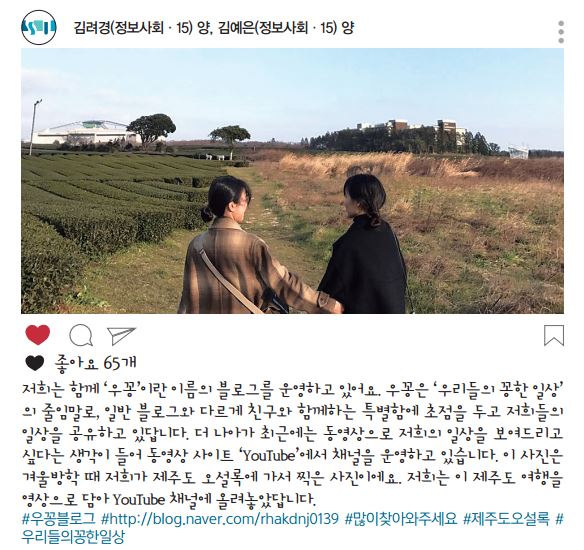 저희는 함께 ‘우꽁’이란 이름의 블로그를 운영하고 있어요. 우꽁은 ‘우리들의 꽁한 일상’의 줄임말로, 일반 블로그와 다르게 친구와 함께하는 특별함에 초점을 두고 저희들의 일상을 공유하고 있답니다. 더 나아가 최근에는 동영상으로 저희의 일상을 보여드리고 싶다는 생각이 들어 동영상 사이트 ‘YouTube’에서 채널을 운영하고 있습니다. 이 사진은 겨울방학 때 저희가 제주도 오설록에 가서 찍은 사진이에요. 저희는 이 제주도 여행을 영상으로 담아 YouTube 채널에 올려놓았답니다.