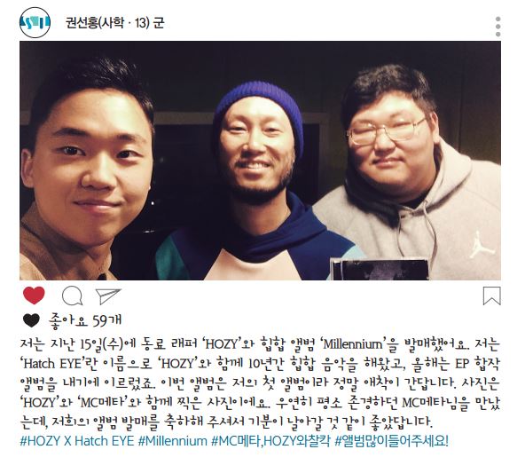 저는 지난 15일(수)에 동료 래퍼 ‘HOZY’와 힙합 앨범 ‘Millennium’을 발매했어요. 저는 ‘Hatch EYE’란 이름으로 ‘HOZY’와 함께 10년간 힙합 음악을 해왔고, 올해는 EP 합작 앨범을 내기에 이르렀죠. 이번 앨범은 저의 첫 앨범이라 정말 애착이 간답니다. 사진은 ‘HOZY’와 ‘MC메타’와 함께 찍은 사진이에요. 우연히 평소 존경하던 MC메타님을 만났는데, 저희의 앨범 발매를 축하해 주셔서 기분이 날아갈 것 같이 좋았답니다.
