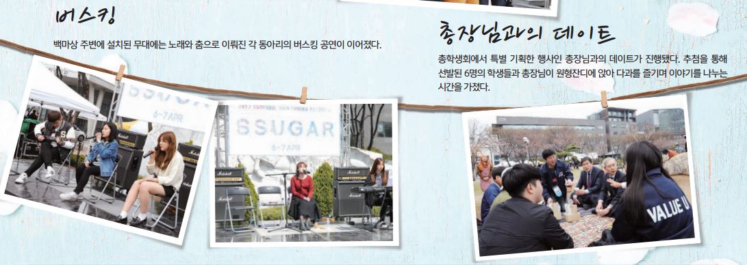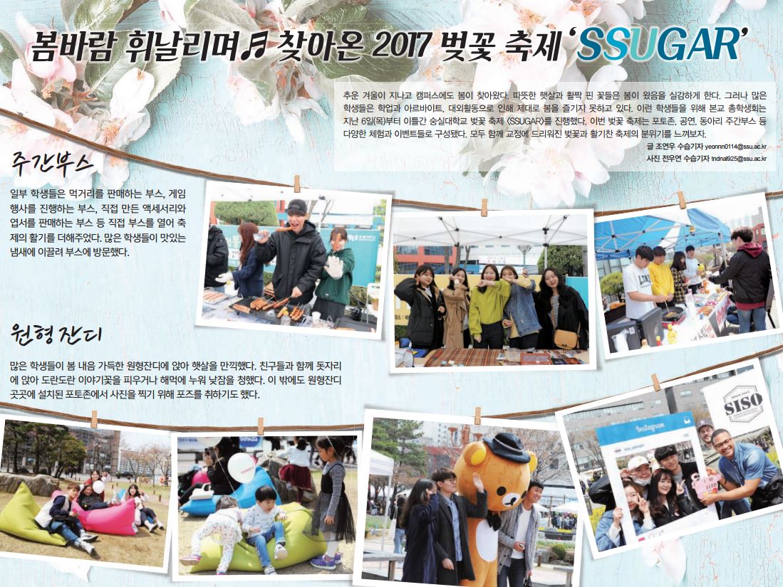 서윤희(불어불문·12) 양 이번 벚꽃 축제 SSUGAR는 학교에 봄이 찾아왔다고 알려주는 신호 같아요. 마침 날씨도 따뜻하고 오랜만에 잔디밭에 돗자리를 깔고 앉아 친구와 도란도란 이야기를 나눌 수 있어서 좋았어요. 이런 시간을 만들어준 총학생회에 감사해요