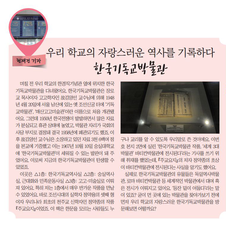 이곳은 △1층: 한국기독교역사실 △2층: 숭실역사실, 근대화와 민족운동사실 △3층: 고고·미술실로 이뤄져 있어요. 특히 저는 1층에서 매우 반가운 작품을 만날 수 있었어요. 바로 조선시대의 실학자 정약용의 셋째 형이자 우리나라 최초의 천주교 신학자인 정약종의 작품 『주교요지』이었죠. 이 책은 한문을 모르는 사람들도 누구나 교리를 알 수 있도록 우리말로 쓴 것이에요. 이번호 본지 2면에 실린 ‘한국기독교박물관 작품, ‘세계 3대 박물관’ 바티칸박물관에 전시된다’라는 기사를 쓰기 위해 취재를 했었는데, 『주교요지』의 저자 정약종의 초상이 바티칸박물관에 전시된다는 사실을 알기도 했어요.
