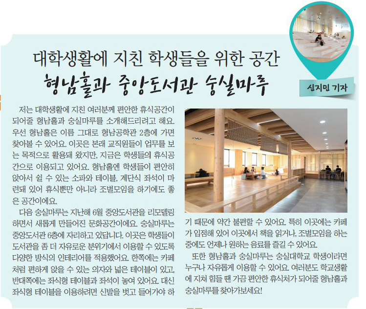 또한 형남홀과 숭실마루는 숭실대학교 학생이라면 누구나 자유롭게 이용할 수 있어요. 여러분도 학교생활에 지쳐 힘들 땐 가끔 편안한 휴식처가 되어줄 형남홀과 숭실마루를 찾아가보세요!