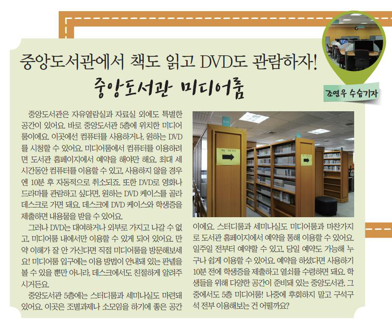 중앙도서관은 자유열람실과 자료실 외에도 특별한 공간이 있어요. 바로 중앙도서관 5층에 위치한 미디어룸이에요. 이곳에선 컴퓨터를 사용하거나, 원하는 DVD를 시청할 수 있어요. 미디어룸에서 컴퓨터를 이용하려면 도서관 홈페이지에서 예약을 해야만 해요. 최대 세 시간동안 컴퓨터를 이용할 수 있고, 사용하지 않을 경우엔 10분 후 자동적으로 취소되죠. 또한 DVD로 영화나 드라마를 관람하고 싶다면, 원하는 DVD 케이스를 골라 데스크로 가면 돼요. 데스크에 DVD 케이스와 학생증을 제출하면 내용물을 받을 수 있어요.