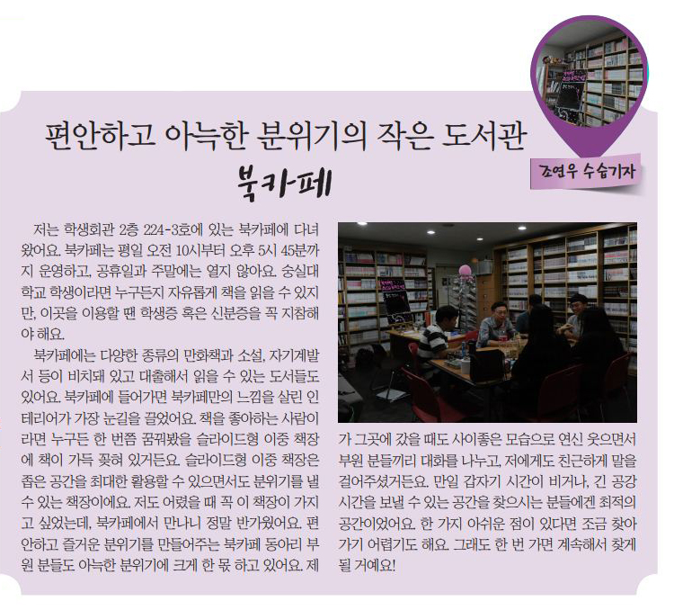 북카페에는 다양한 종류의 만화책과 소설, 자기계발서 등이 비치돼 있고 대출해서 읽을 수 있는 도서들도 있어요. 북카페에 들어가면 북카페만의 느낌을 살린 인테리어가 가장 눈길을 끌었어요. 책을 좋아하는 사람이라면 누구든 한 번쯤 꿈꿔봤을 슬라이드형 이중 책장에 책이 가득 꽂혀 있거든요. 슬라이드형 이중 책장은 좁은 공간을 최대한 활용할 수 있으면서도 분위기를 낼 수 있는 책장이에요. 저도 어렸을 때 꼭 이 책장이 가지고 싶었는데, 북카페에서 만나니 정말 반가웠어요. 편안하고 즐거운 분위기를 만들어주는 북카페 동아리 부원 분들도 아늑한 분위기에 크게 한 몫 하고 있어요. 제가 그곳에 갔을 때도 사이좋은 모습으로 연신 웃으면서 부원 분들끼리 대화를 나누고, 저에게도 친근하게 말을 걸어주셨거든요. 만일 갑자기 시간이 비거나, 긴 공강 시간을 보낼 수 있는 공간을 찾으시는 분들에겐 최적의 공간이었어요. 한 가지 아쉬운 점이 있다면 조금 찾아가기 어렵기도 해요. 그래도 한 번 가면 계속해서 찾게 될 거예요!