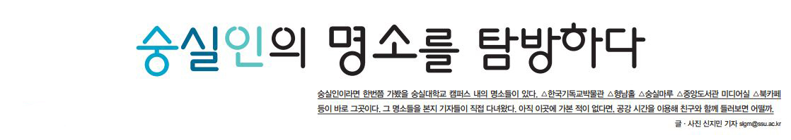 숭실인이라면 한번쯤 가봤을 숭실대학교 캠퍼스 내의 명소들이 있다. △한국기독교박물관 △형남홀 △숭실마루 △중앙도서관 미디어실 △북카페 등이 바로 그곳이다. 그 명소들을 본지 기자들이 직접 다녀왔다. 아직 이곳에 가본 적이 없다면, 공강 시간을 이용해 친구와 함께 들러보면 어떨까.