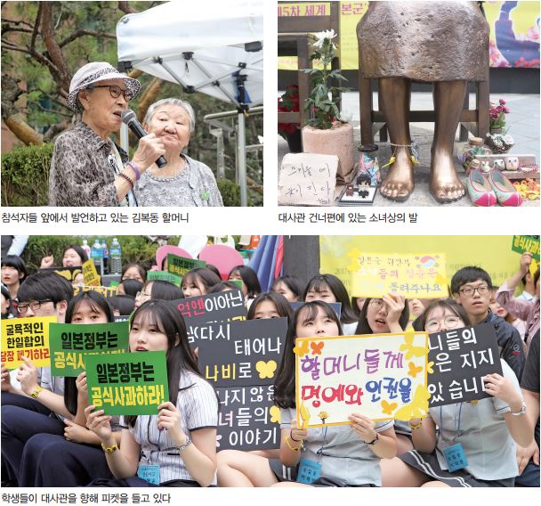 수요시위는 항상 ‘바위처럼’을 제창하는 것으로 시작된다. 언제나 그랬듯이 이번 수요시위도 ‘바위처럼’을 부르는 것으로 시작됐다. 그러나 이날 수요시위의 분위기는 평소보다 무거웠다. 이번 시위가 이틀 전 노환으로 별세하신 하상숙 할머니의 추모 시위로 치러졌기 때문이다. 故하상숙 할머니는 국제 법정에 참석해 피해를 증언하는 등 일본군 ‘위안부’ 문제 해결을 위해 끊임없이 노력해왔다. 시위에 참석한 김복동 할머니와 길원옥 할머니 옆으로 故하상숙 할머니의 영정이 모셔졌다. 할머니들은 故하상숙 할머니를 추모하며 참석자들과 함께 묵념했다. 김복동 할머니는 참석자들을 향해 “한 번 아프고 나니 말이 잘 나오지 않는다”며 “평화의 길이 열려 젊은이들이 마음 놓고 살아가도록 전쟁이 없어야 한다”고 말했다.