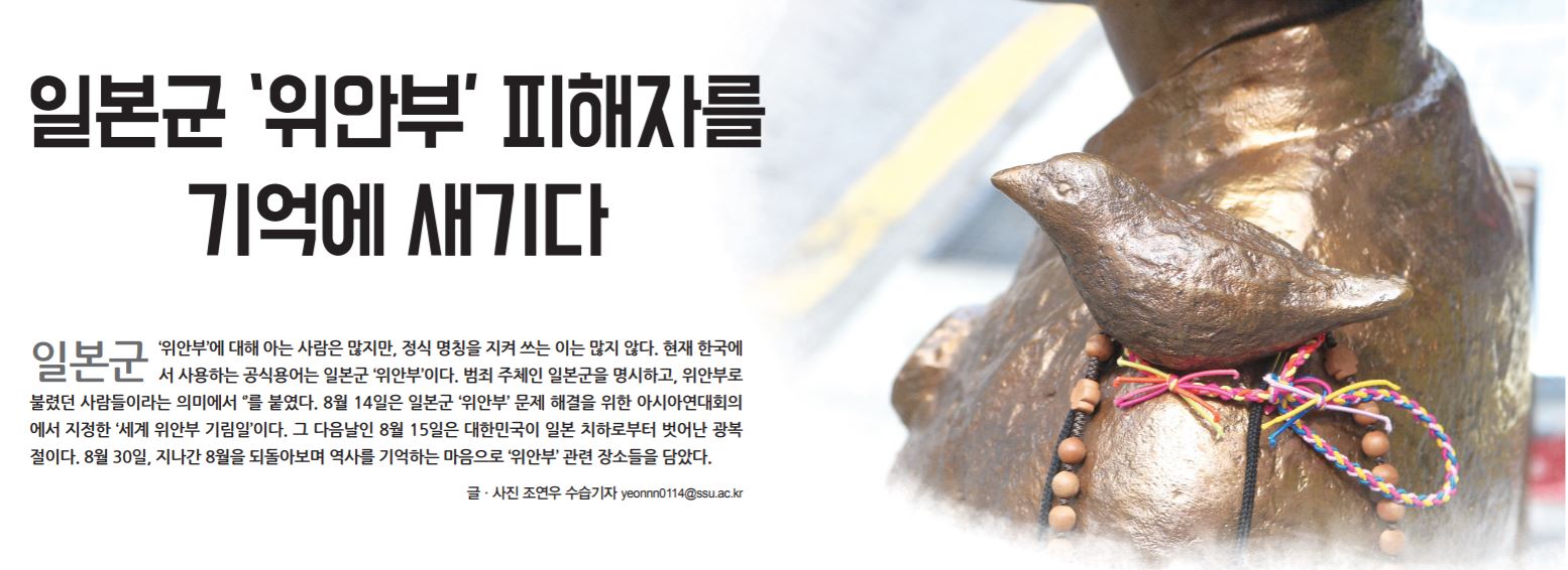 일본군 ‘위안부’에 대해 아는 사람은 많지만, 정식 명칭을 지켜 쓰는 이는 많지 않다. 현재 한국에서 사용하는 공식용어는 일본군 ‘위안부’이다. 범죄 주체인 일본군을 명시하고, 위안부로 불렸던 사람들이라는 의미에서 ‘’를 붙였다. 8월 14일은 일본군 ‘위안부’ 문제 해결을 위한 아시아연대회의에서 지정한 ‘세계 위안부 기림일’이다. 그 다음날인 8월 15일은 대한민국이 일본 치하로부터 벗어난 광복절이다. 8월 30일, 지나간 8월을 되돌아보며 역사를 기억하는 마음으로 ‘위안부’ 관련 장소들을 담았다.