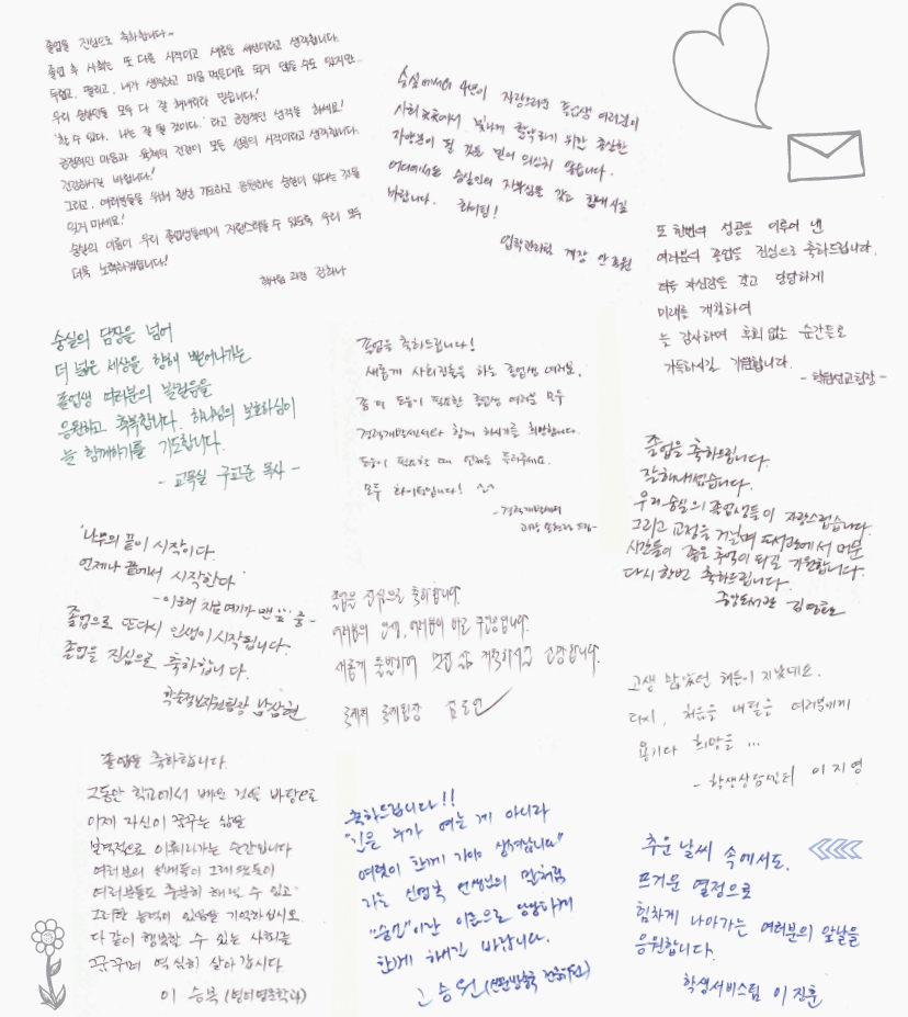 매년 2월 중순엔 4년간 본교에서 학문을 갈고 닦던 수많은 졸업생이 학교를 떠나곤 한다. 각자의 꿈을 안고 들어왔던 대학이지만 취업난 탓에 직업을 구하기도 어려운 실정이다. 이렇듯 어려운 길을 걷는 졸업생들을 위해 먼저 사회에 뛰어든 본교 직원들이 격려의 말을 건넨다고 한다. 경험이 묻어나는 따뜻한 손 글씨를 본지와 함께 만나보자.