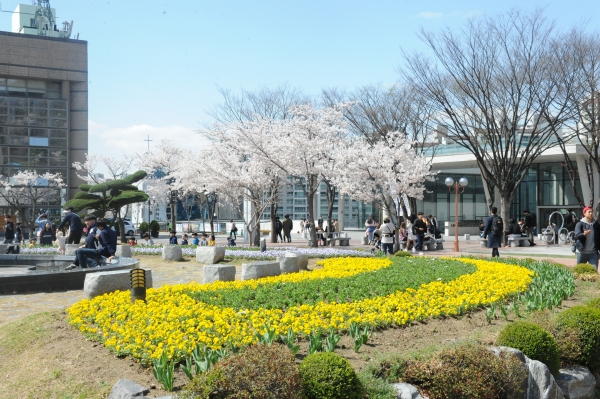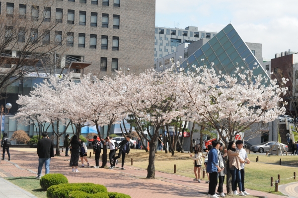 본교의 봄철은 교내의 아름다운 벚꽃으로도 유명합니다. 요즘 만개한 벚꽃에 많은 학생들이 밖으로 나와 사진을 찍는 모습이 보입니다. 최근 SNS에도 본교의 벚꽃사진이 많이 게시되곤 하는데요. 지난 4일(수)부터 이틀간 계속된 비와 갑작스럽게 추워진 날씨에 벚꽃이 지지는 않을까하는 걱정도 있었습니다. 그러나 이러한 꽃샘추위에도 오히려 벚꽃들이 더욱 만개한 모습을 보고 괜한 우려임을 느꼈습니다. 본교의 상징인 백마상 앞에 있는 벚꽃나무를 지나면 원형 분수대 주변의 꽃들 역시 피어있었습니다. 분수대 주변의 돌로 된 벤치에는 종종 커플들이 함께 앉아있는 모습을 발견할 수 있습니다. 꽃샘추위도 얼른 물러나고 봄 향기가 물씬 풍기는 본교에서 얼른 자유롭게 봄을 즐겼으면 좋겠습니다.