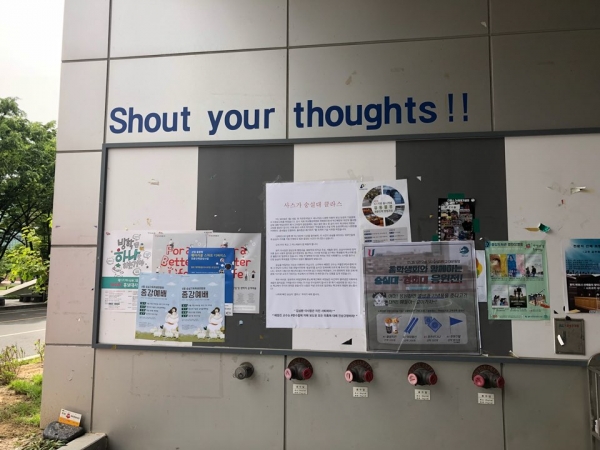 아시나요? 캠퍼스 곳곳에는 본교생들에게 전하는 글귀가 적혀 있습니다. 우선 조만식기념관과 신양관 사이에 위치한 게시판에는 ‘Shout your thoughts!!’라는 문구가 적혀있네요. 자신의 의견을 표현하는 것에 부담을 덜라는 의미죠. 이어 학생식당 3층 입구 쪽에는 ‘TABLE FOR EVERYONE’이란 문구가 써있습니다. 학생식당은 모두의 공간이기에 소중히 다뤄야한다는 의미인 것 같네요. 그리고 중앙도서관 앞 정자 쪽에 ’금연‘이라는 표지판도 생겼습니다. 해당 위치는 금연구역임에도 많은 사람들이 흡연하던 장소입니다. 흡연구역을 지켜 흡연해야 한다는 경고인 듯하네요. 이처럼 캠퍼스 곳곳에는 본교생들에게 전하는 메시지가 있습니다. 캠퍼스를 돌아다니며 기회가 되면 위와 같은 숨겨진 문구를 찾아보는 것도 재밌을 것 같네요.