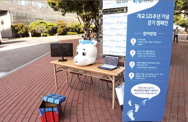 지난 5일(수)부터 본교에서 개교 121주년 걷기 캠페인이 시작됐습니다. 통일을 염원하는 숭실인들의 걸음이 모여 이루어지는 캠페인으로, 서울-평양까지의 거리인 총 260km를 성인 보폭 0.6m로 환산하여 총 43,000 걸음을 달성하는 것이 이번 이벤트의 목표입니다. 숭실 중앙광장 시계탑 옆을 지나다 보면 이번 이벤트를 주최한 프레슈 학생기자단들이 열심히 홍보하는 것을 볼 수 있습니다. 수업을 들으러 열심히 교내를 걸어 다니면 금방 만보를 채울 수 있는데요. 이를 교내 설치된 포토존에서 인증사진을 찍어 보내면 프레슈에서 매일 3명씩 선정하여 소정의 상품을 지급한다고 합니다. 오는 21일(금)까지 이벤트를 진행한다고 하니 더 많은 걸음이 하루 빨리 모여 평양으로 이어졌으면 합니다.