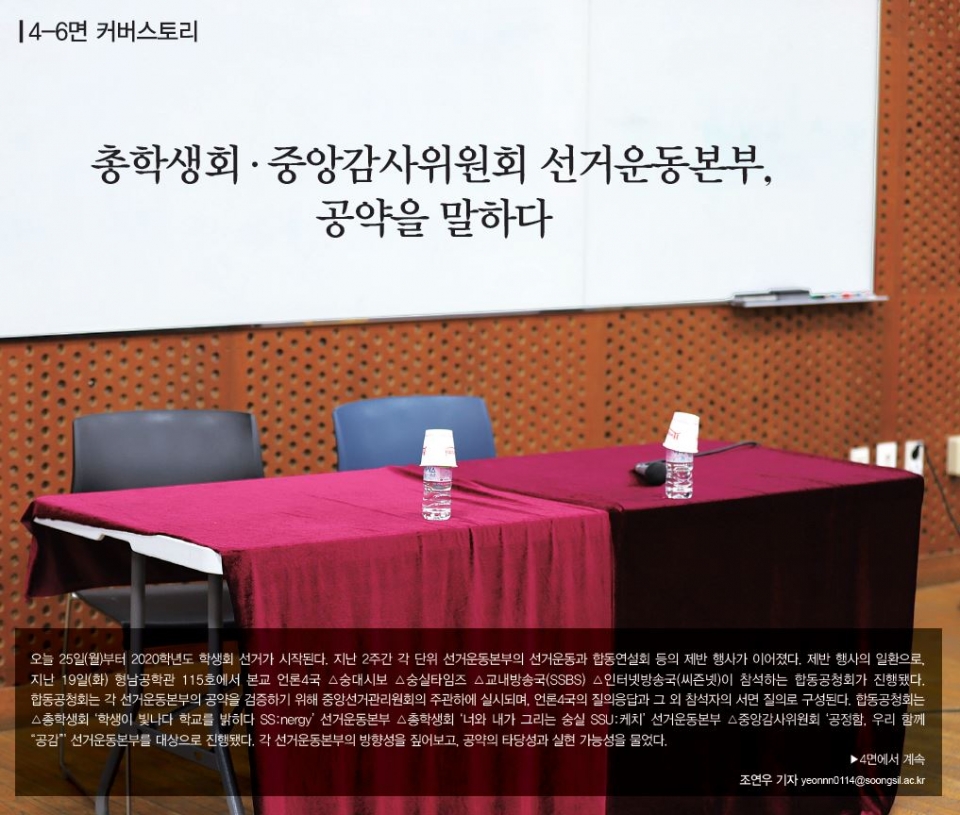 오늘 25일(월)부터 2020학년도 학생회 선거가 시작된다. 지난 2주간 각 단위 선거운동본부의 선거운동과 합동연설회 등의 제반 행사가 이어졌다. 제반 행사의 일환으로, 지난 19일(화) 형남공학관 115호에서 본교 언론4국 △숭대시보 △숭실타임즈 △교내방송국(SSBS) △인터넷방송국(씨즌넷)이 참석하는 합동공청회가 진행됐다. 합동공청회는 각 선거운동본부의 공약을 검증하기 위해 중앙선거관리원회의 주관하에 실시되며, 언론4국의 질의응답과 그 외 참석자의 서면 질의로 구성된다. 합동공청회는 △총학생회 ‘학생이 빛나다 학교를 밝히다 SS:nergy’ 선거운동본부 △총학생회 ‘너와 내가 그리는 숭실 SSU:케치’ 선거운동본부 △중앙감사위원회 ‘공정함, 우리 함께 “공감”’ 선거운동본부를 대상으로 진행됐다. 각 선거운동본부의 방향성을 짚어보고, 공약의 타당성과 실현 가능성을 물었다.