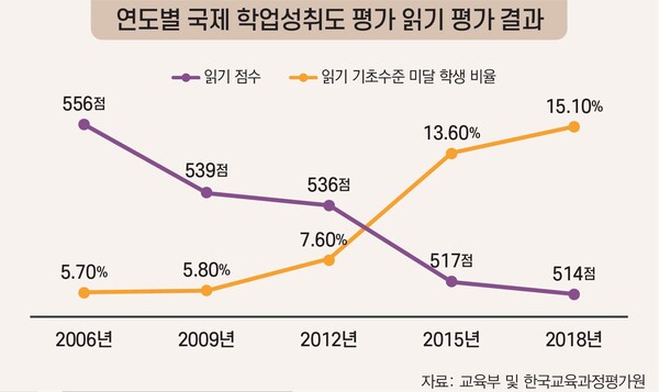 더불어 국제적인 수준에서 비교해보았을 때도 우리나라 학생들의 문해력 측정치는 낮아지고 있었다. 경제협력개발기구에 소속된 79개국의 만 15세 학생을 대상으로 3년마다 △읽기 △수학 △과학 영역의 성취 수준을 평가하는 ‘국제 학업성취도 평가(이하 학업 평가)’ 결과를 통해 이를 가늠할 수 있다. 이 결과에 따르면 우리나라의 ‘읽기 점수’ 추이는 지속적인 하락세를 보이고 있다. 지난 2006년 학업 평가 결과 읽기 점수는 556점으로 전 세계 1등 수준이었지만 △2009년 539점 △2012년 536점 △2015년 517점 △2018년 514점까지 계속해서 하락하고 있다.