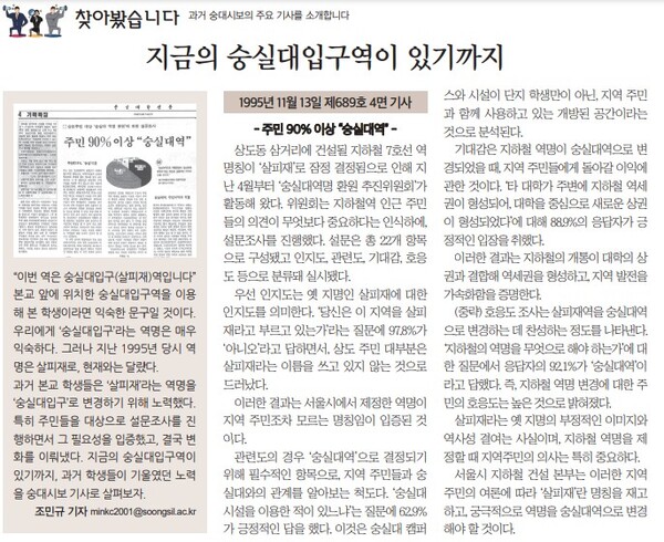 과거 본교 학생들은 ‘살피재’라는 역명을 ‘숭실대입구’로 변경하기 위해 노력했다. 특히 주민들을 대상으로 설문조사를 진행하면서 그 필요성을 입증했고, 결국 변화를 이뤄냈다. 지금의 숭실대입구역이 있기까지, 과거 학생들이 기울였던 노력을 숭대시보 기사로 살펴보자.